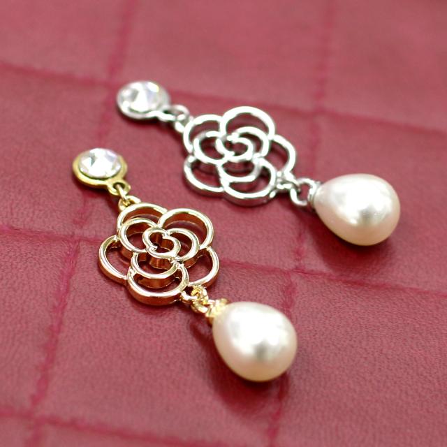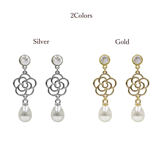 grace貼るピアス 透かしカメリア×ドロップパール シルバー ゴールド 貼り替えテープ付き ノンホールピアス シールピアス 透かしフラワー お花 パール ドロップ 貼るだけ レディース イヤリング 痛くない おしゃれ シンプル 金属アレルギー 貼る ピアス