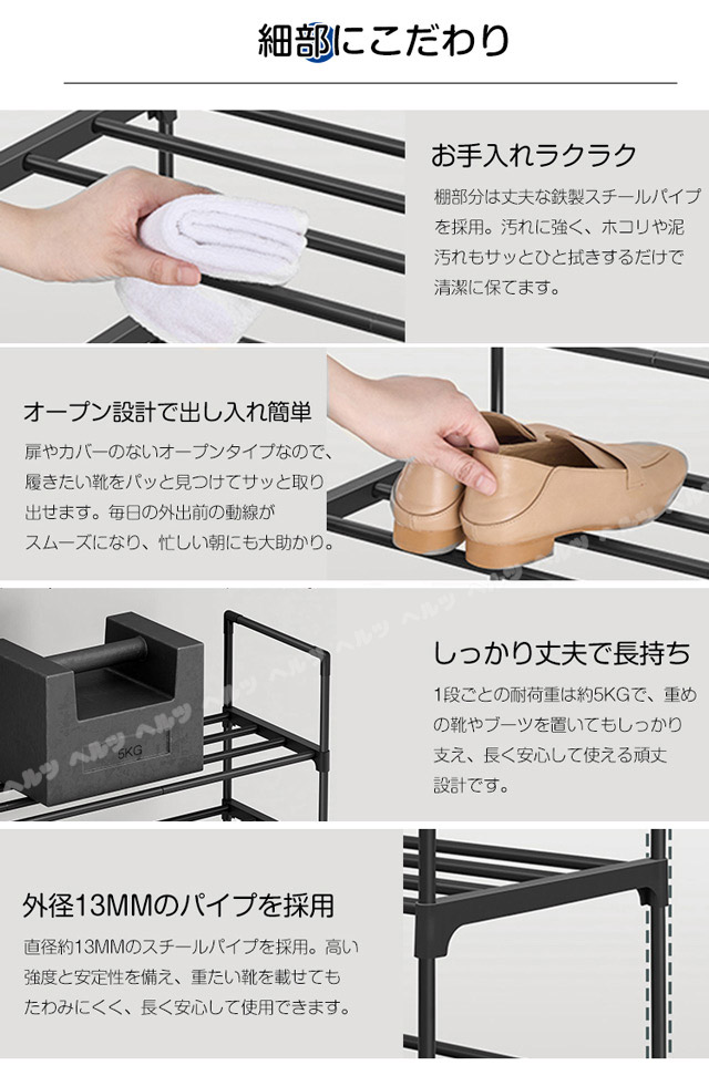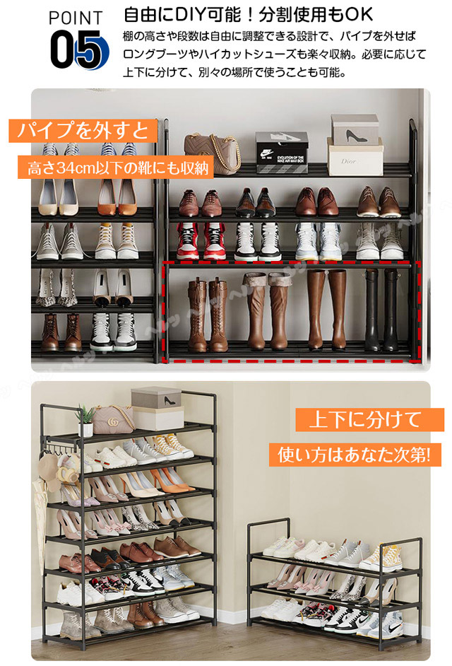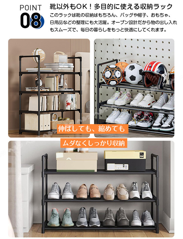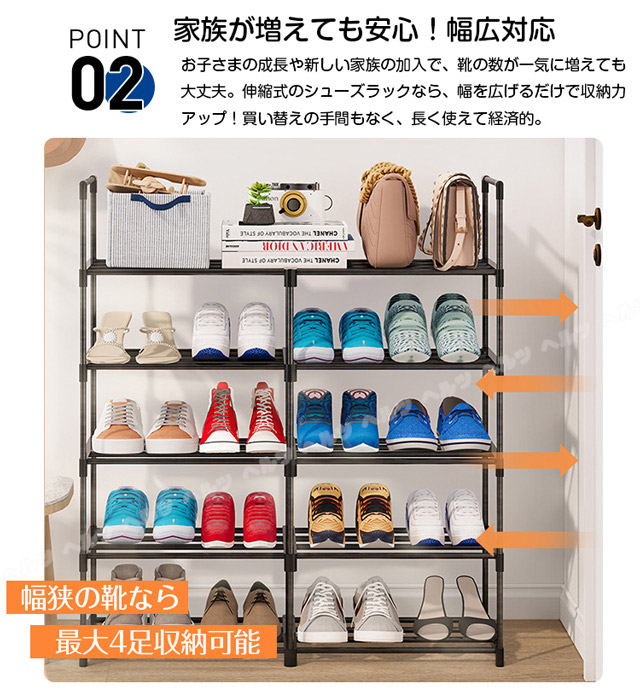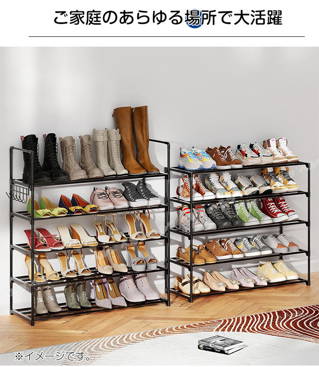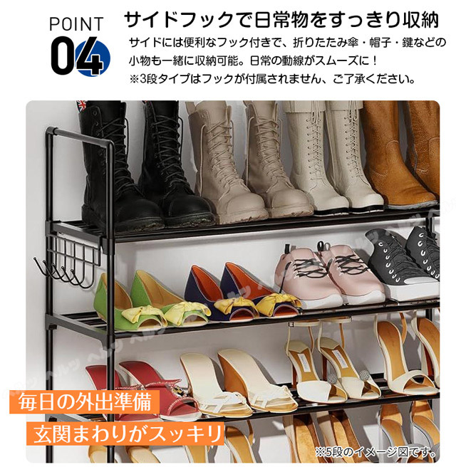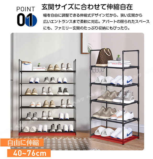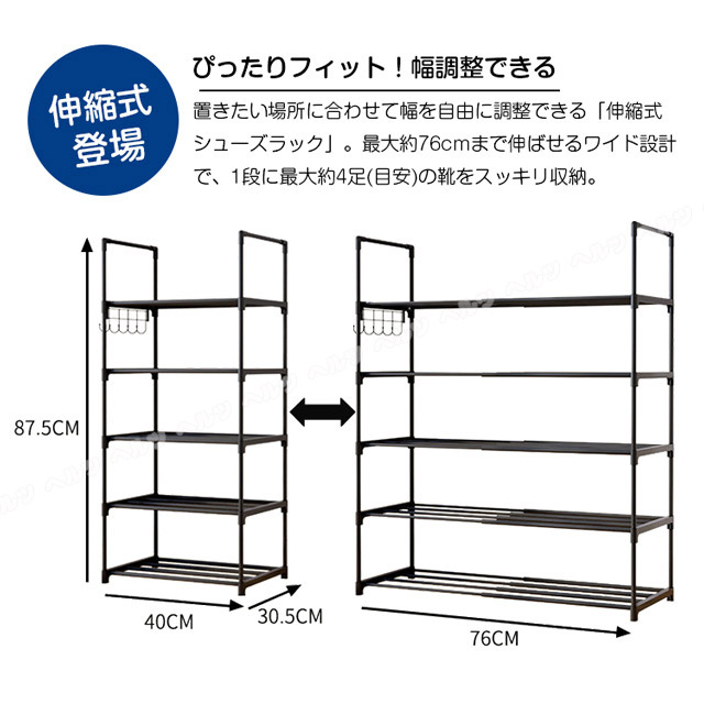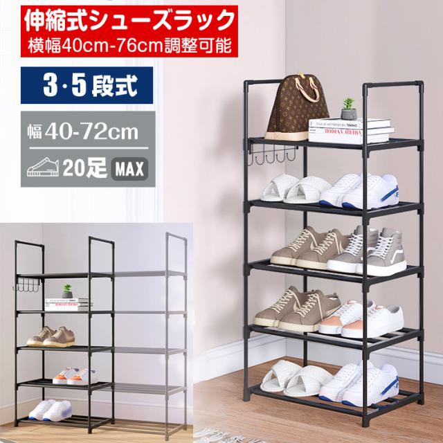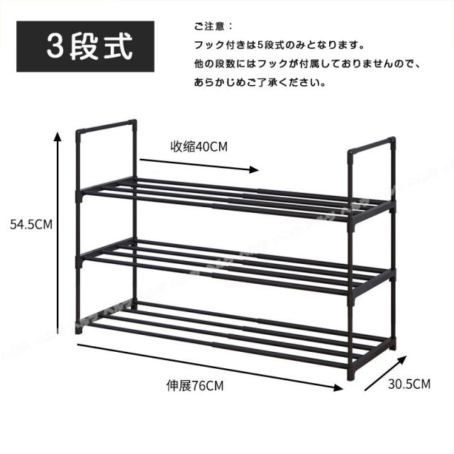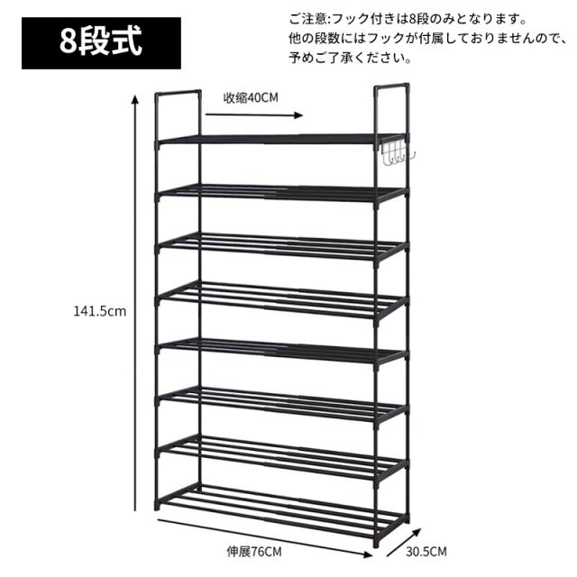 「クーポン配布中」「3/5/8段式 幅40-76cm調整」新登場 伸縮 シューズラック スリム 省スペース 安定感アップ 収納フック付き 多層収納シューズラック 大容量 靴箱 下駄箱 組立簡単 シューズボックス 靴収納ラック おしゃれ 母の日 敬老の日 プレゼント