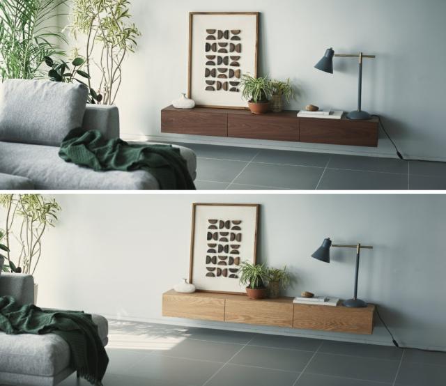 ホテルの一室のような空間を演出するフロートタイプのテレビ台です。 浮かせて設置することで圧迫感を与えず、部屋全体を広く見せてくれます。