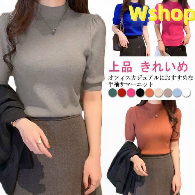 半袖 夏 サマーニット 五分袖 オフィス 40代 ニット 春夏 秋 きれいめ パフスリーブ 韓国ファッション 50代 リブニット 30代 レディース トップス 上品 ハイネック タートル 20代 春 カジュアル パワショル