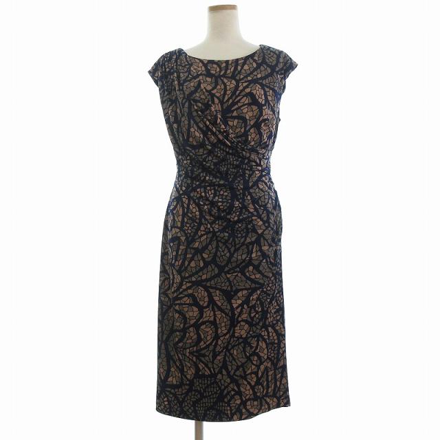 【中古】コネクテッドアパレル ワンピース フレンチスリーブ ひざ丈 総柄 ドレープ 10 紺 ベージュ 大きいサイズ