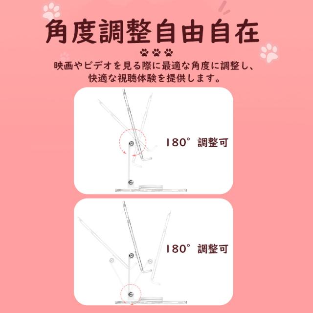 360度回転するので、お好みの角度でを固定できます。どの角度からでも画面が見えます。タブレットスタンドは大幅な角度調整が可能です。映画やビデオを見る際に最適な角度に調整し、快適な視聴体験を提供します。