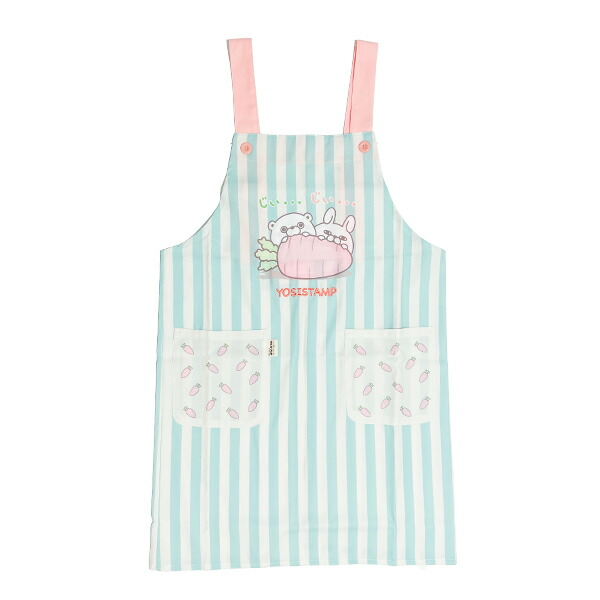 ヨッシースタンプでお馴染みのうさぎさんとくまさんがニンジン越しに覗きこんでいるデザインが可愛いエプロンです。優しい色合いとポケットのニンジン柄のプリントがおすすめポイント♪後ろもボタン留めなので着用も楽々です!ヨッシースタンプファンにはたまりません☆ぜひ同デザインのスリッパと合わせてお使いください♪【サイズ】M〜L(着丈:88cm/身幅:51cm)