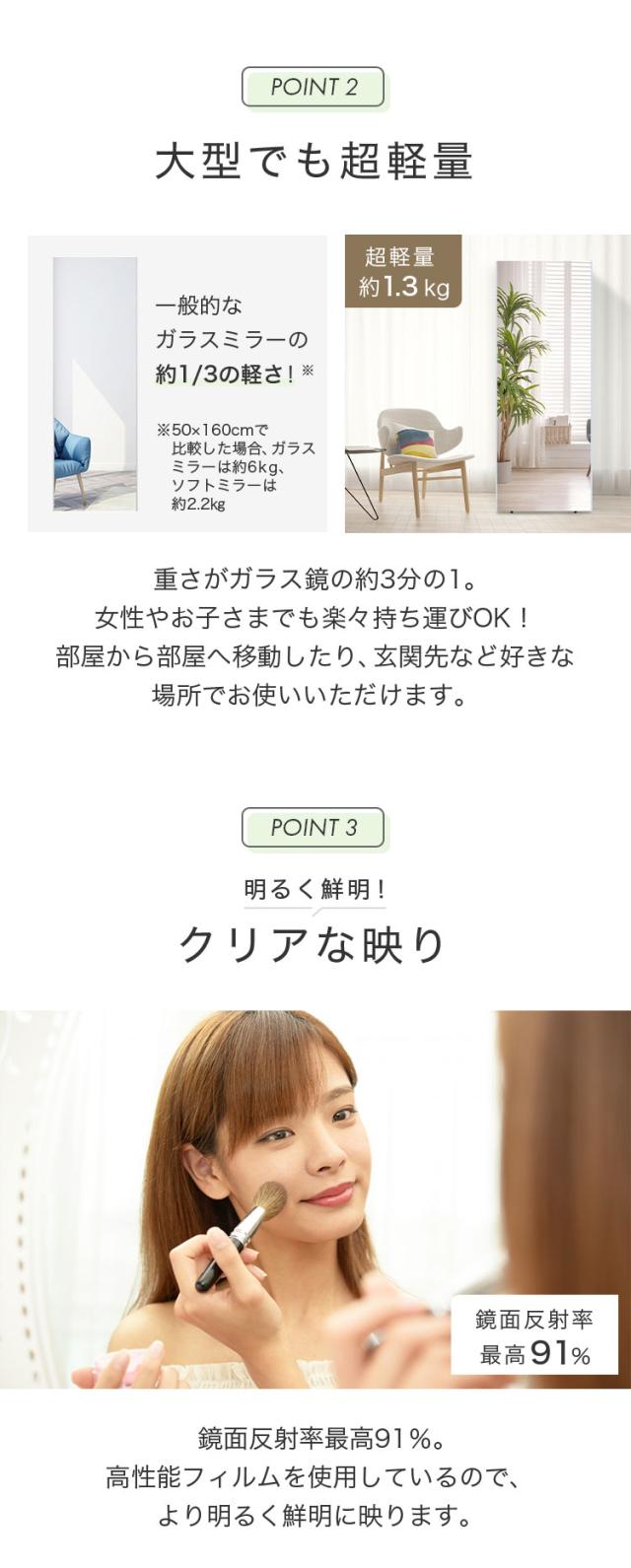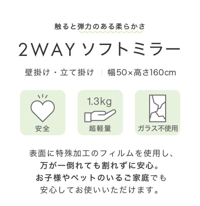 ソフトミラー、ソフト、幅50cm、高さ160cm、2wayソフトミラー、壁掛け鏡、ウォールミラー、立て掛け鏡、スタンドミラー、全身ミラー、薄型ミラー、薄型、フィルム製、フィルムミラー、ソフト、鏡、ミラー、メイク、ファッションチェック、運動、ヨガ、鮮明、高反射率、軽量設計、おしゃれ、かわいい、韓国インテリア、シルバー、ホワイト、ナチュラル、木目調、飛散防止