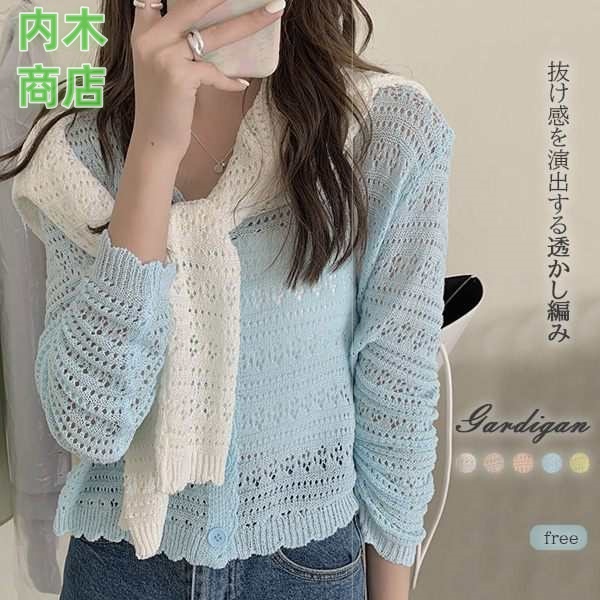 2025新作 透かし編み ニット カーディガン サマーニット セーター 長袖 カギ編み 透け感
