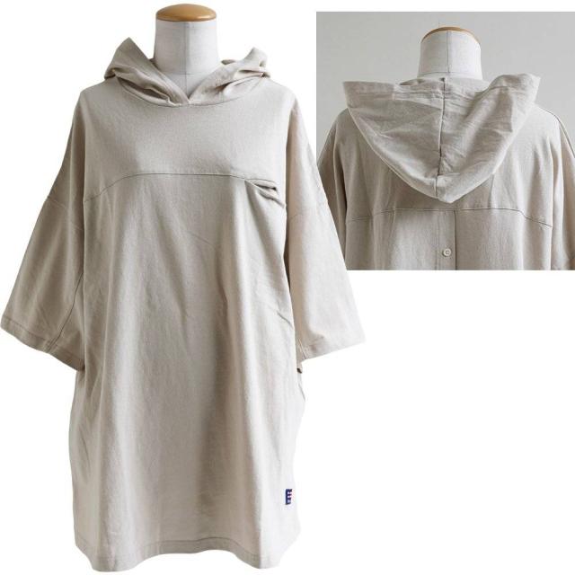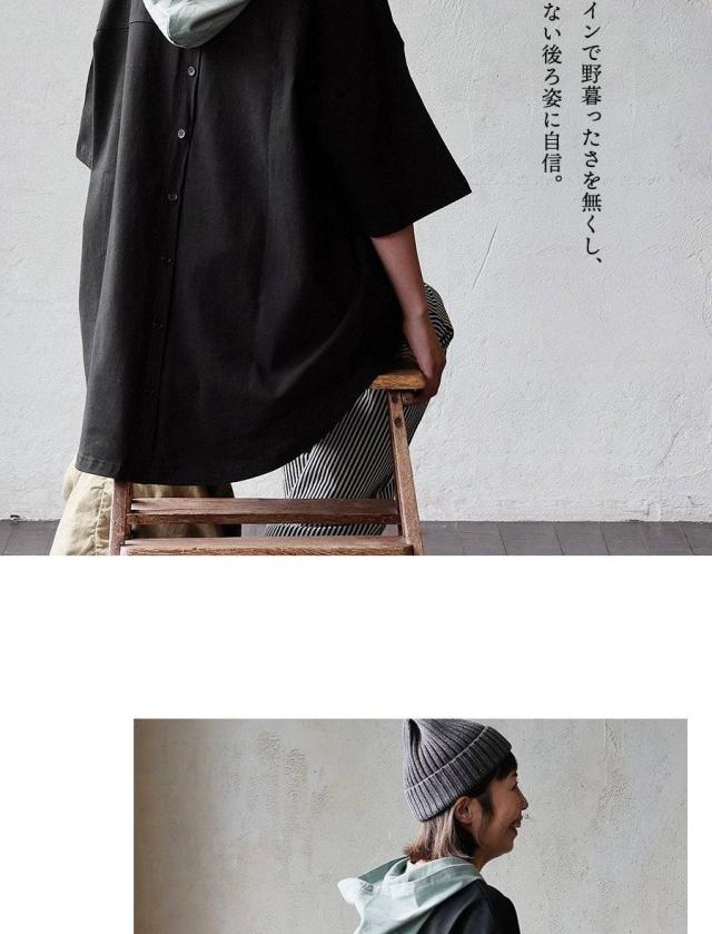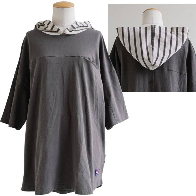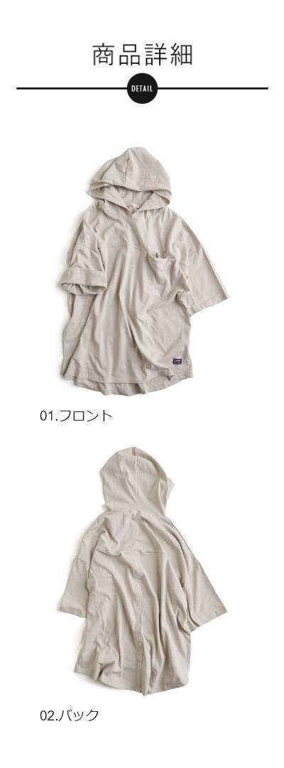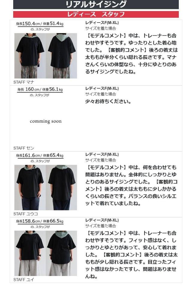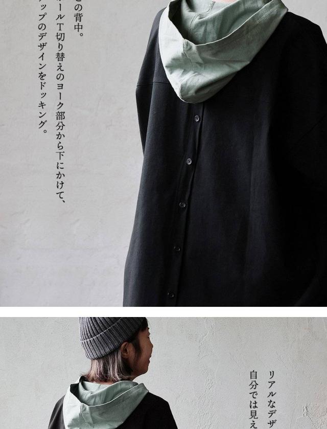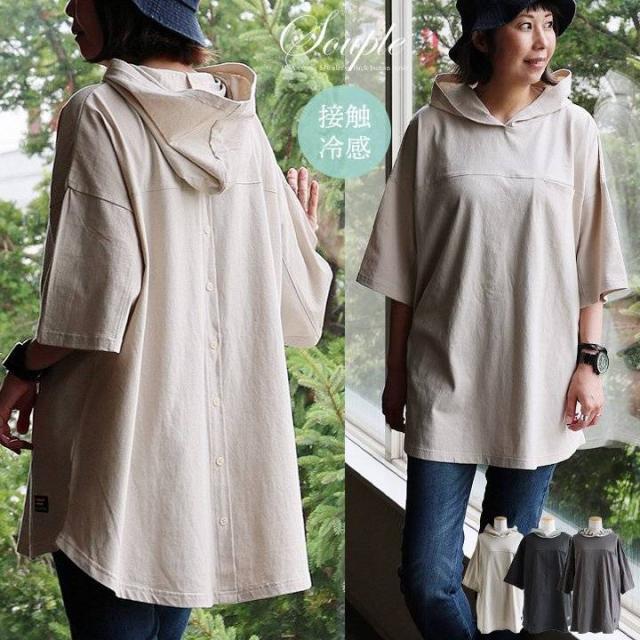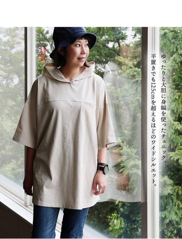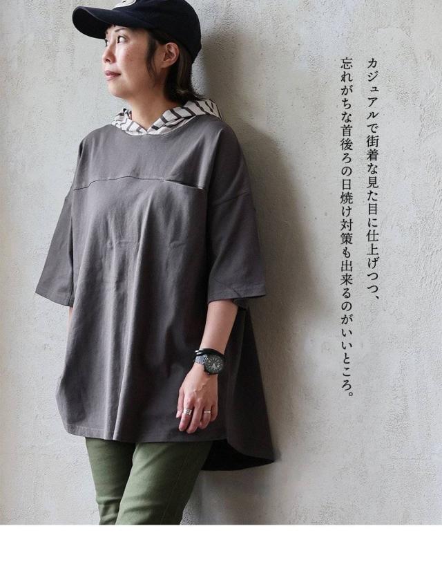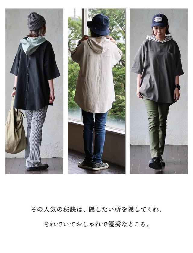 チュニック 6分袖 ロング ワイド レディース すっきり 着痩せ フーディー 切替 夏 初秋 パーカー tシャツ 重ね着 柔らか 綿100% USA コットン バック ボタン ポケット お尻 二の腕 隠れる カバー 5分袖 半袖 大人 カジュアル パティ