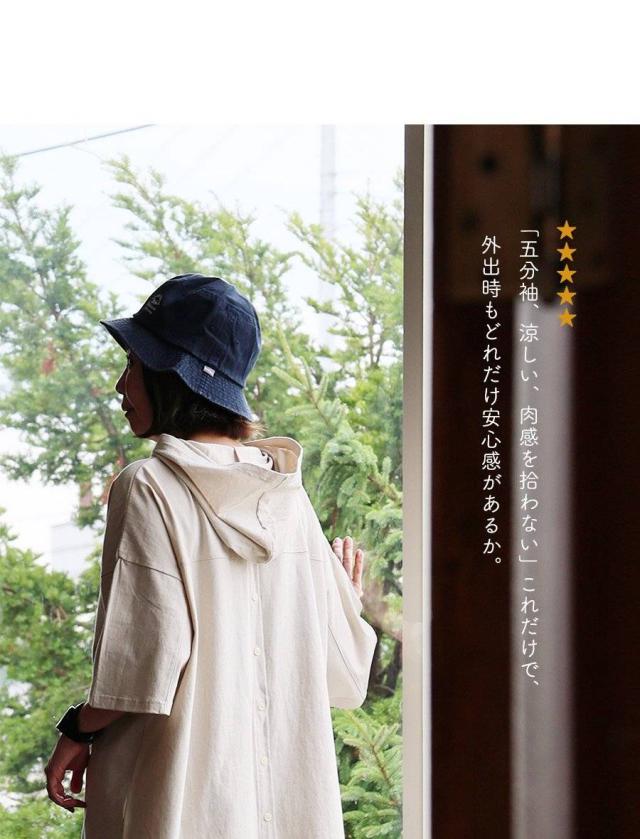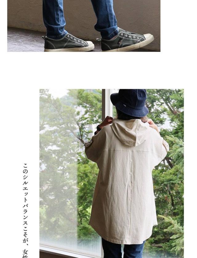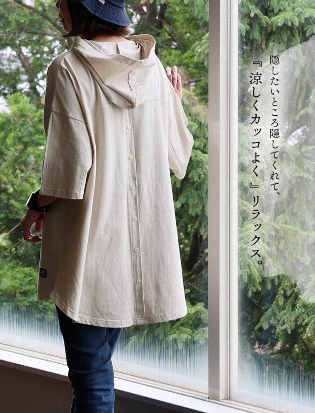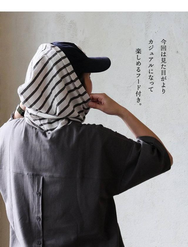 ・フード付きでカジュアルで街着な見た目に仕上げつつ、忘れがちな首後ろの日焼け対策も出来るのがいいところ。