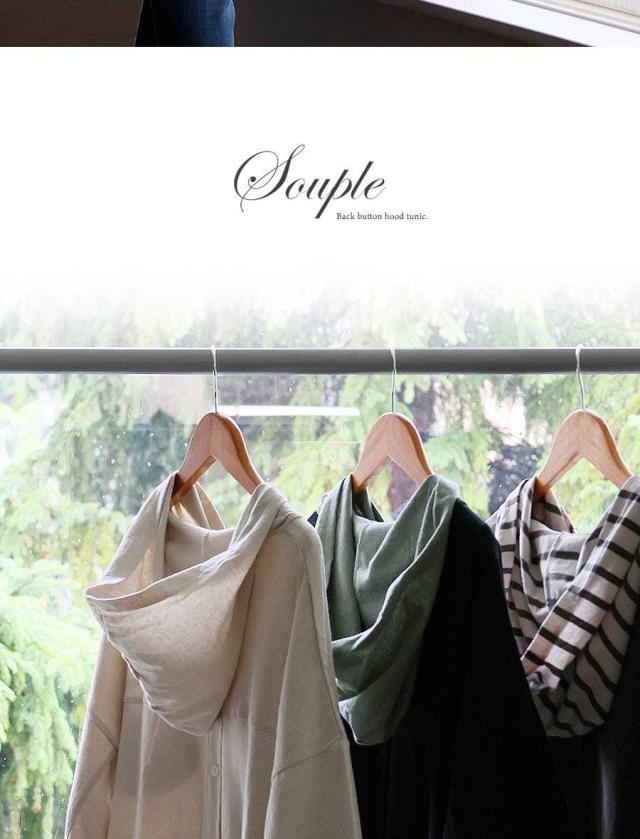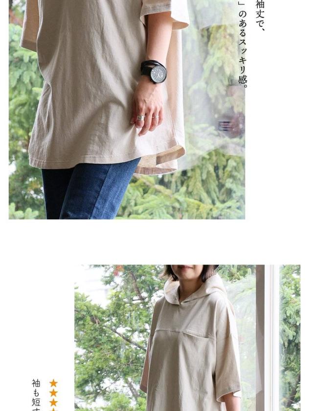 チュニック 6分袖 ロング ワイド レディース すっきり 着痩せ フーディー 切替 夏 初秋 パーカー tシャツ 重ね着 柔らか 綿100% USA コットン バック ボタン ポケット お尻 二の腕 隠れる カバー 5分袖 半袖 大人 カジュアル パティ Souple スプル