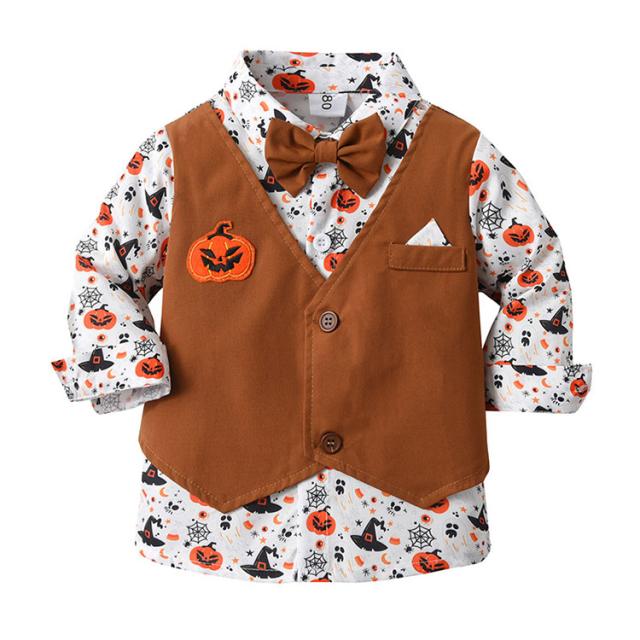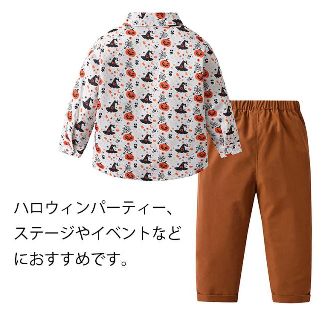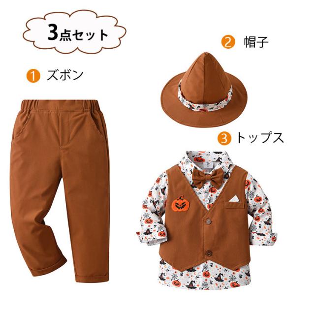 キッズ ハロウィン 男の子スーツ 3点セット フォーマル パーティー ベビー かわいい かぼちゃ 長袖 秋冬 蝶ネクタイ付き シャツ ズボン 帽子 幼稚園 小学生 おしゃれ 誕生日 プレゼント ギフト