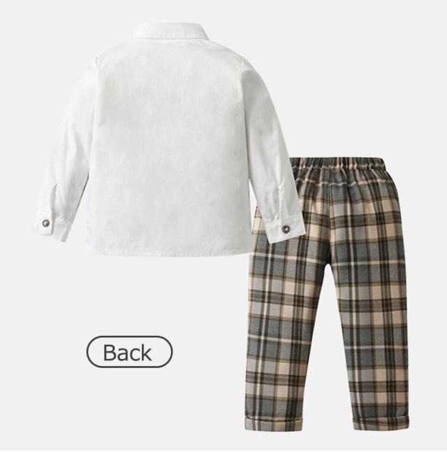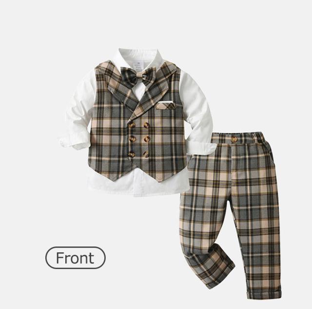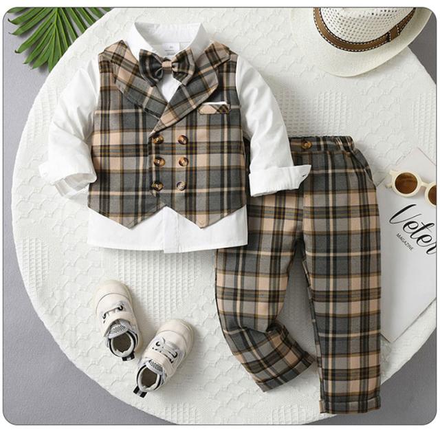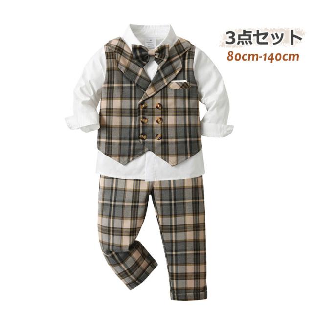 男の子 フォーマルスーツ 3点セット ベビースーツ チェック柄 七五三 蝶ネクタイ付き 子供服 フォーマル 長袖 長ズボン 上下セット 入園式 卒園式 誕生日 パーティー 結婚式 お呼ばれ 80 90