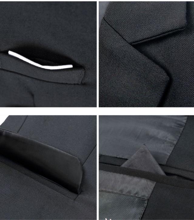 シンプルな無地のデザインで、ブラックとネイビーの2色から選べます。ジャケット、ベスト、ズボン、ネクタイがセットになっており、トータルコーディネートが簡単に完成します。