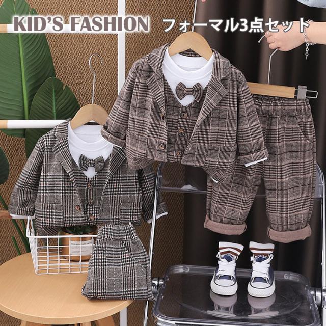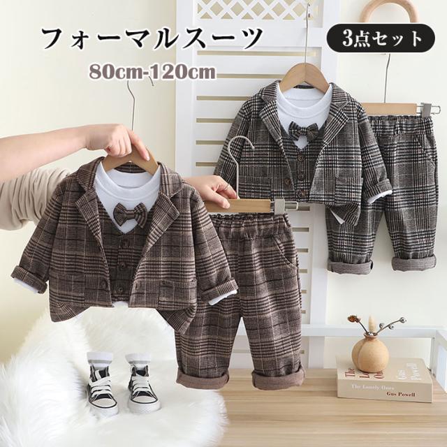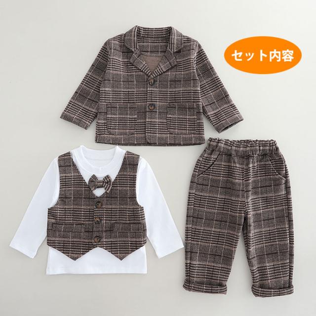 ベビー フォーマルスーツ 3点セット 男の子 ベビースーツ チェック柄 七五三 ジャケット ズボン シャツ 蝶ネクタイ付き 子供服 紳士服 フォーマル セットアップ 上下セット 入園式 卒園式 誕生日