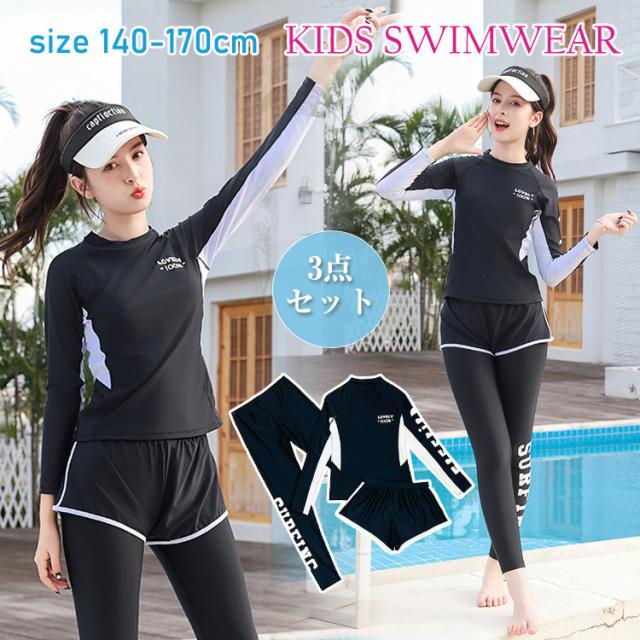 キッズ 水着 女の子 ジュニア 子供水着 長袖 トップス タイツ ショートパンツ 子ども用 みずぎ セパレート 上下3点セット スイムウエア ダイビングスーツ UV対策 日焼け防止 ラッシュガード フ