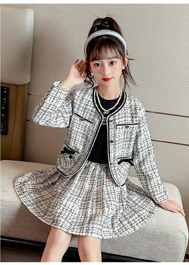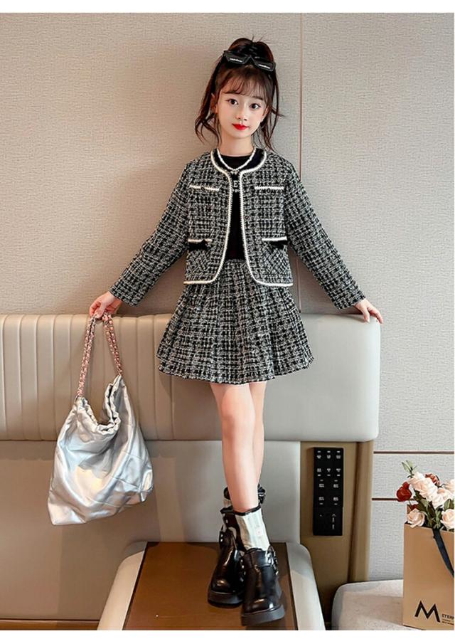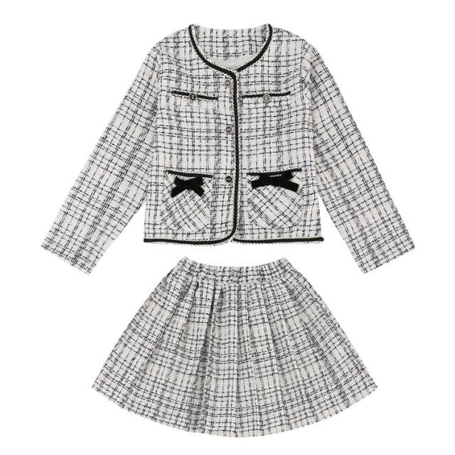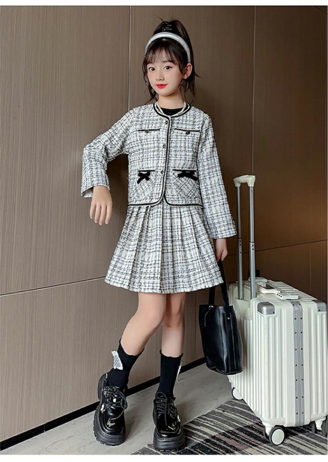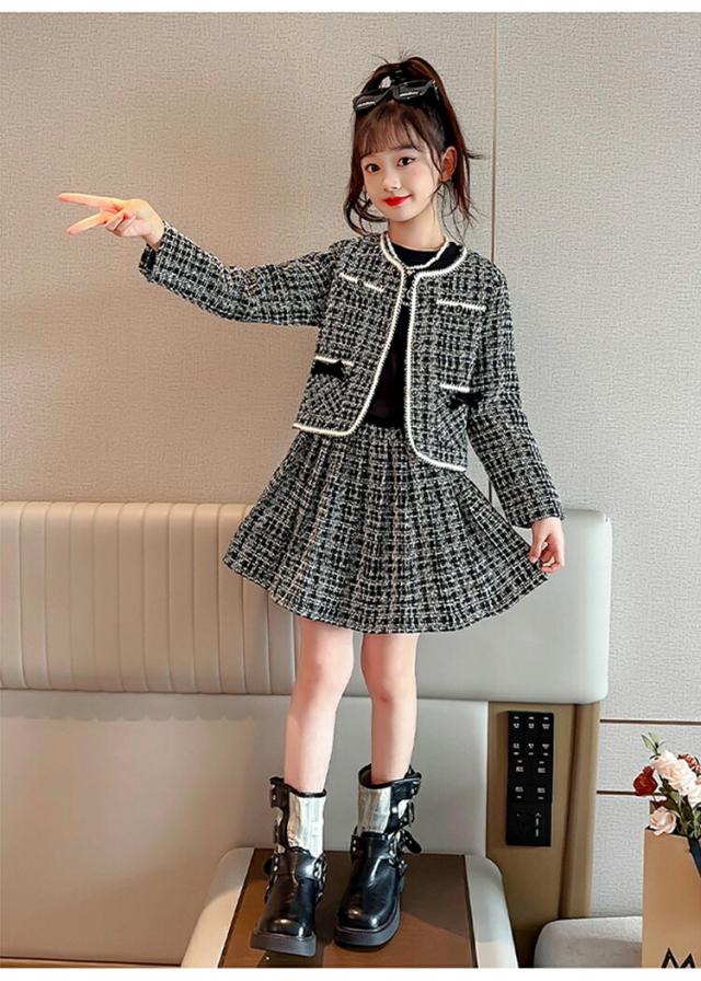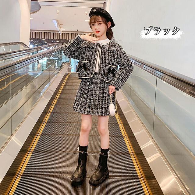 ツイード素材のチェック柄が上品で、ボレロとスカートの2点セットが魅力的。ジュニアサイズの110cmから170cmまで揃っているので、成長に合わせて選べます。