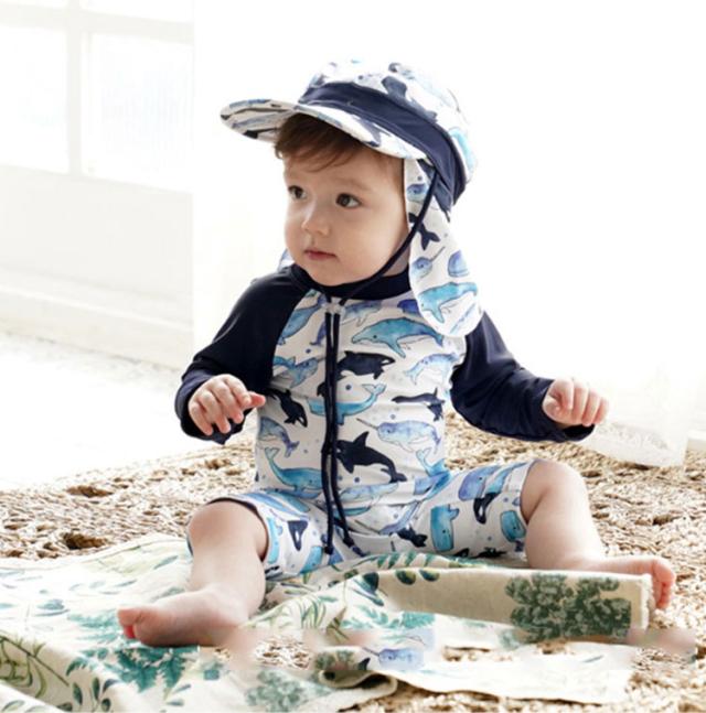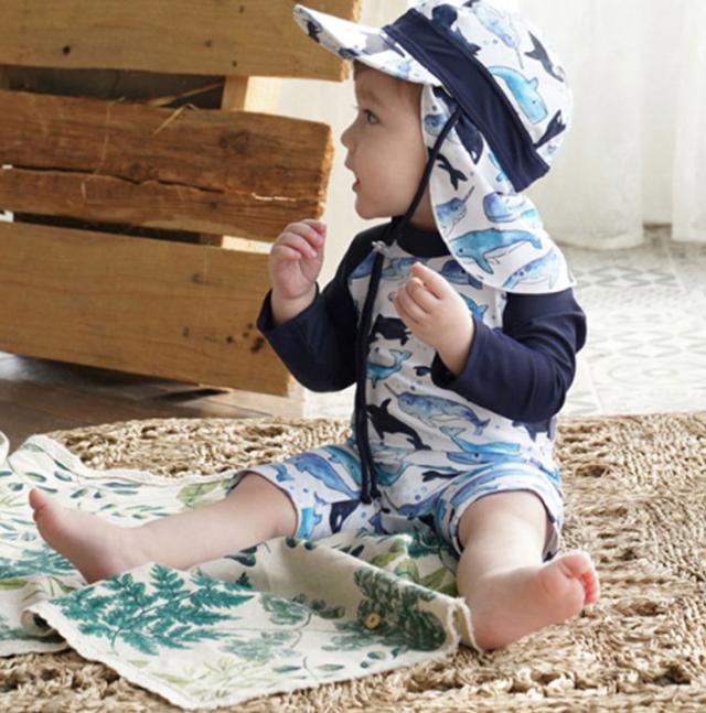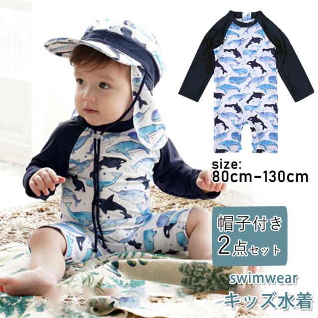 キャップ付き キッズ 水着 男の子 オールインワン ベビー水着 長袖 紫外線カット ラッシュガード スクール水着 ロンパース 子供 スイミング UVカット 幼稚園 保育園 小学校 レッスン フィットネ
