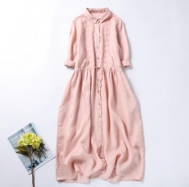 リネンシャツワンピース ロングワンピースワンピース レディースファッション ナチュラル 7分袖 麻ワンピース 無地ワンピース