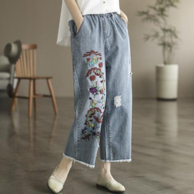 ワイドパンツ デニムパンツ花柄刺繍レディースガウチョ ロングパンツ ジーンズダメージ加工ボトムス春秋ハイウエスト