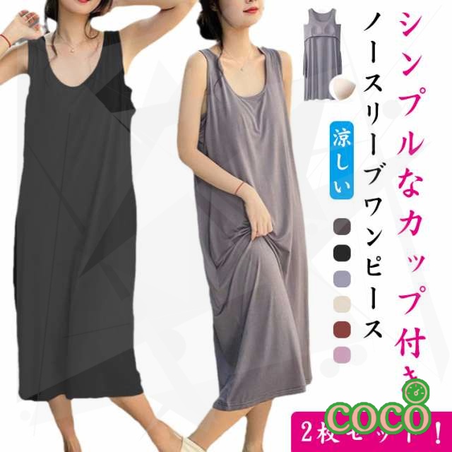 【パワフル】ロングワンピース 2枚セット! レディース Tシャツワンピース 2枚セット! 可愛い インナー ノースリーブ シンプル 無地 部屋着 ゆったり 体型カバー ワンピース カップ付き 涼しい ひんやり アイスシルクパジャマ 無地 春 夏 お出かけ