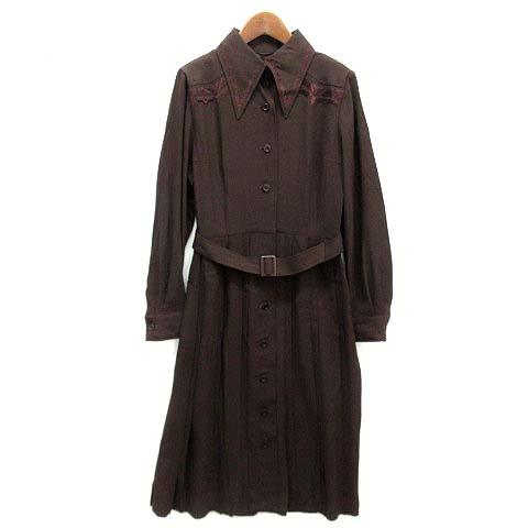 【中古】ハナエモリ HANAE MORI HIYOSHIYA シャツ ワンピース ロング 刺繍 プリーツ 長袖 ブラウン 茶 11 昭和 レトロ レディース