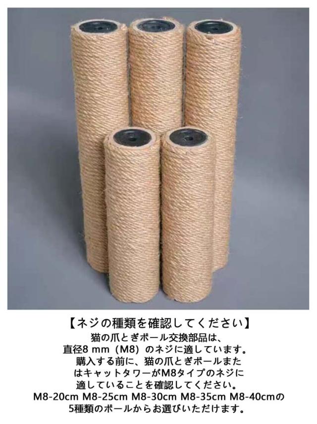 | ボロボロになった支柱を新品に交換!爪研ぎポール 2本セット。 爪の引っかかりが良い「麻縄」。 ねこちゃんのストレス解消に! 【ネジの種類を確認してください】猫の爪とぎポール交換部品は、直径8 mm(M8)のネジに適しています。 購入する前に、猫の爪とぎポールまたはキャットタワーがM8タイプのネジに適していることを確認してください。M8-20cm M8-25cm M8-30cm M8-35cm M8-40cmの5種類のポールからお選びいただけます。 【健康的に爪とぎ】猫の爪とぎポールは、猫や子猫が遊んだり、爪を研いだり、爪を健康に保ち、猫が自然で健康的な爪とぎの習慣を身につけるのに役立ちます。 | |