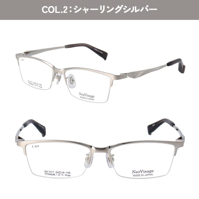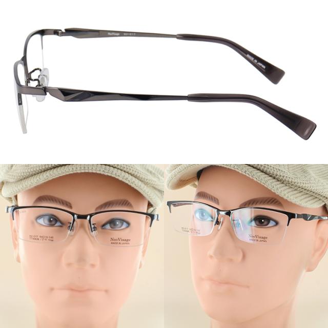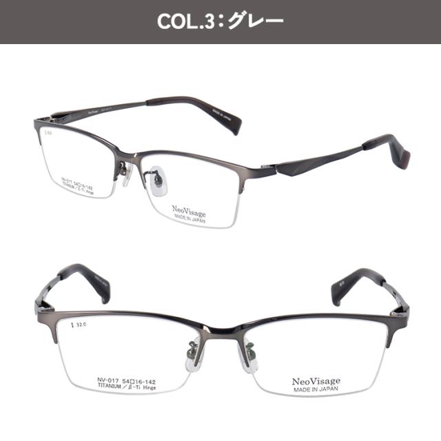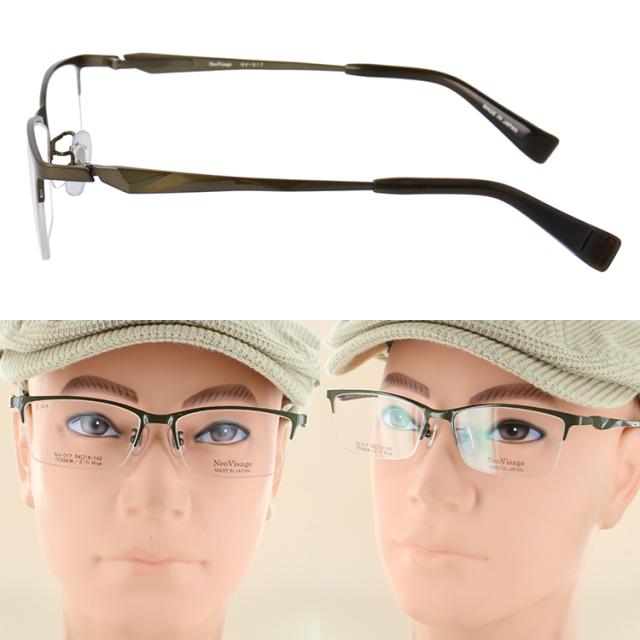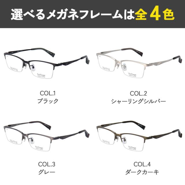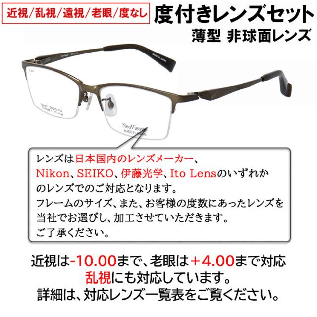 度付き メガネ 眼鏡 日本製 メイドインジャパン メンズ 男性 近視 遠視 老眼 乱視 度なし だて 伊達 ブランド チタンフレーム スクエア ハーフリム 軽量 ネオヴィサージュ NV-017 ブラック シルバー グレー ダークカーキ かっこいい 薄型 1.60 非球面レンズ セット