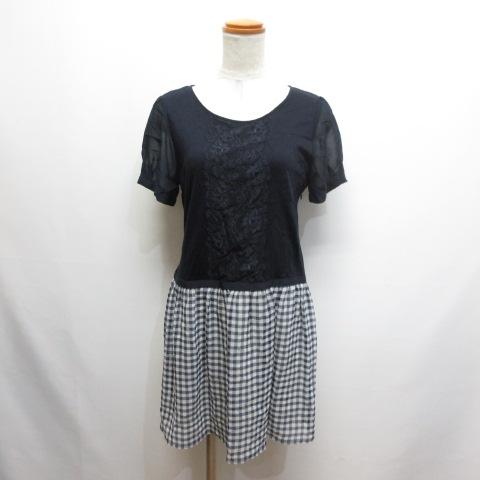 【中古】エフデ ef-de 異素材切替え 半袖 ワンピース 9 ネイビー レース装飾 シフォン袖 裏地付き レディース
