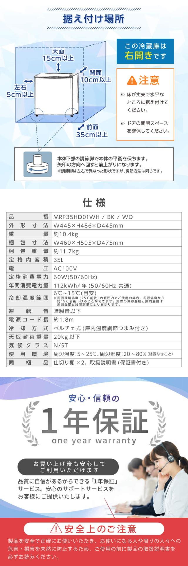 冷蔵庫 35L ペルチェ式 コンパクト 霜取り不要 大容量 右開き 1ドア 幅45cm サブ冷蔵庫 温度調節 静音 省スペース 仕切り調節可能 白 ホワイト MRP35HD01 マクスゼン