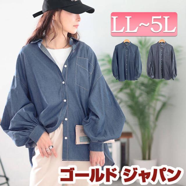 冬新作 大きいサイズ レディース トップス シャツ ブラウス ボリュームスリーブシャンブレーシャツ シャンブレーシャツ デニムシャツ 長袖 ボリュームスリーブ ボリューム袖 シャンブレー タック ポケット 夏 秋服 春服 LL 2L 3L 4L 5L サックス ネイビー ゴールドジャパン