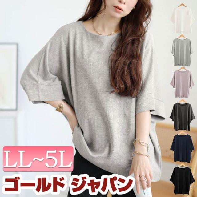 春新作 大きいサイズ レディース トップス Tシャツ カットソー コットンワッフルドルマンTシャツ 5分袖 クルーネック ドルマン ワッフル ストレッチ 夏服 秋服 春服 LL 2L 3L 4L 5L ブラック 黒 ホワイト 白 杢グレー ネイビー パープル チャコールグレー ゴールドジャパン