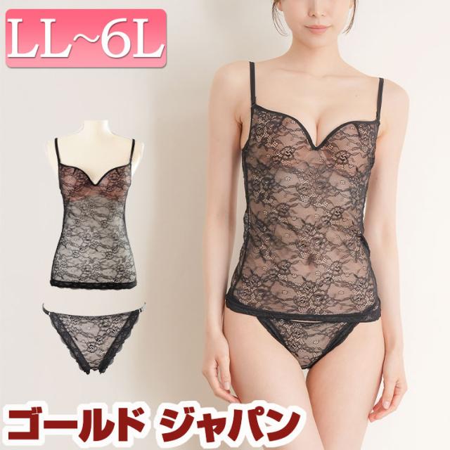 冬新作 大きいサイズ レディース インナー 下着 セット カップ付きシアーレースキャミソール&シアーレースショーツ2点セット ショーツ パンツ キャミソール キャミ ブラ カップ付き カップ レース シアー 夏服 秋服 冬服 春服 LL 2L 3L 4L 5L ブラック 黒 ゴールドジャパン