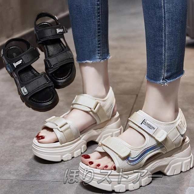 送料無料 厚底サンダル レディース スポーツサンダル 厚底 オープントゥ ウェッジサンダル ウェッジソール スニーカー サンダル 美脚 幅広 軽量 通気性 ストラップ 合成皮革 PU シンプル カジュアル アウトドア 走れる 履きやすい 歩きやすい 柔らかい