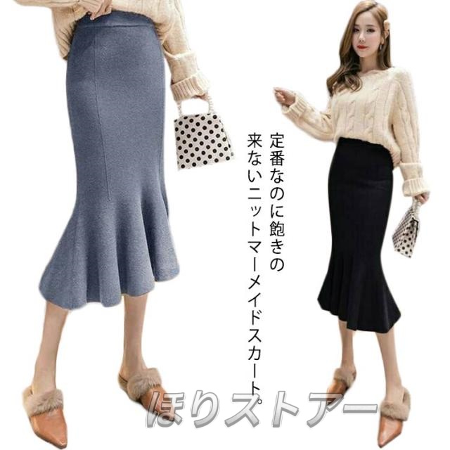 ニットスカート 膝丈 フリルスカート スカート シンプル マーメイドシルエット ハイウエスト タイトスカート マーメイドスカート おしゃれ 通勤着 きれいめ 黒 無地