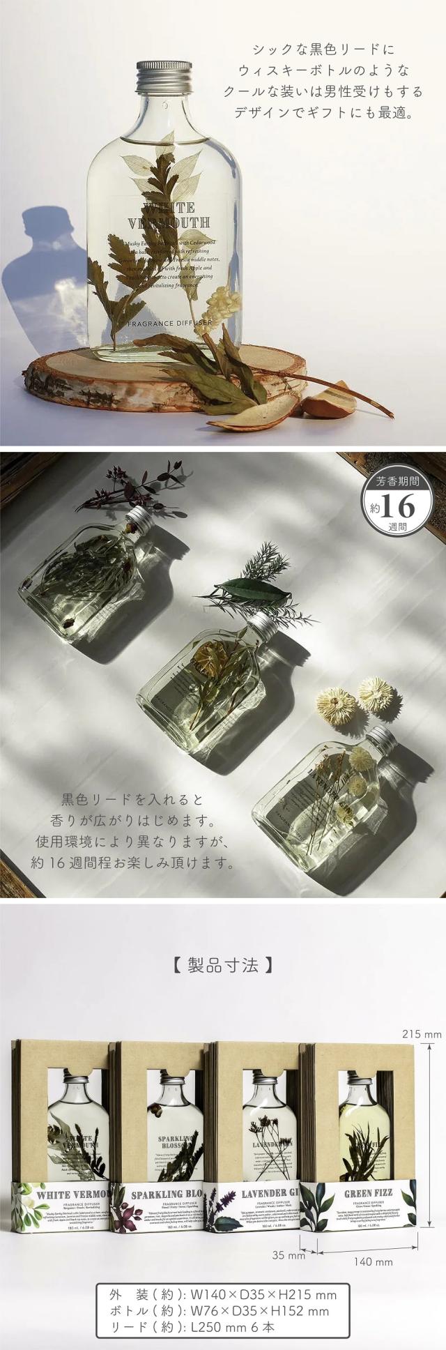 彩り豊かなドライフラワーと香りをスタイリッシュなボトルに閉じ込めた全4種類をご用意しました。シックな黒色リードにウィスキーボトルの様なクールな装いは男性受けもするデザインでギフトにも最適。リードを入れると香りが広がりはじめ、使用環境にもよりますが約16週間程お楽しみ頂けます。