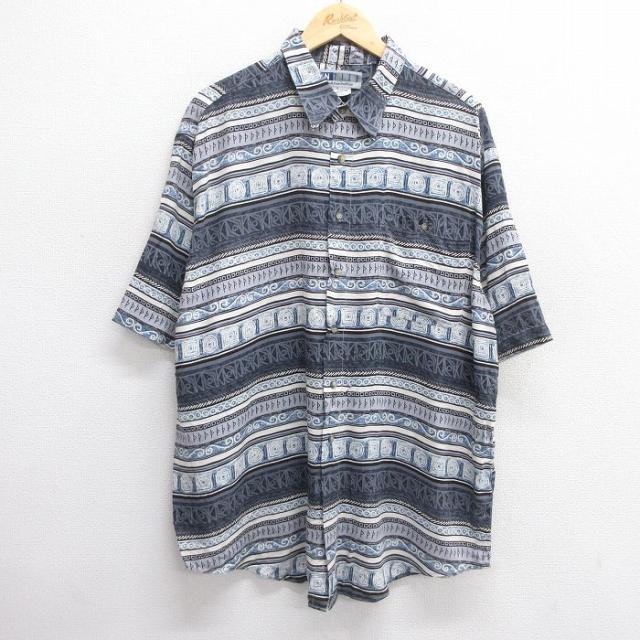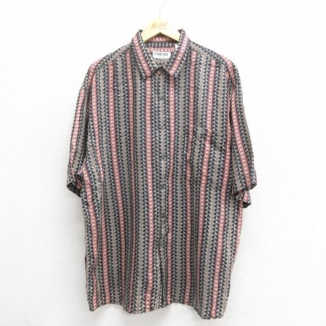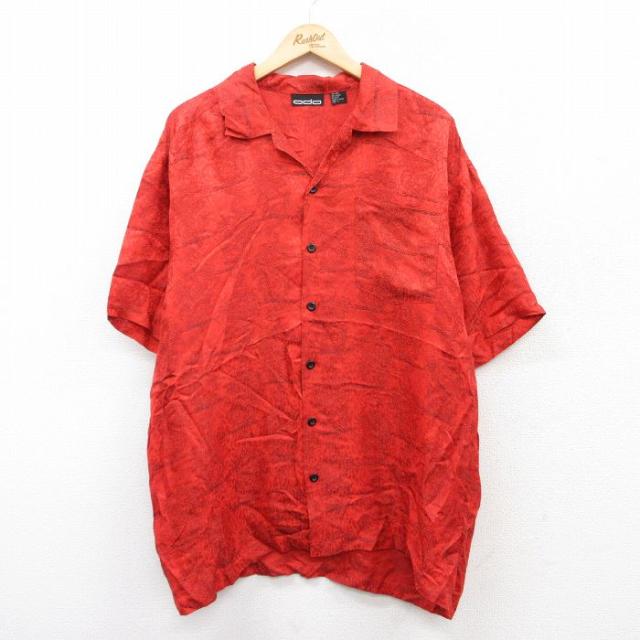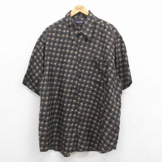 古着 半袖 シャツ メンズ 総柄 ロング丈 シルク 黒 ブラック XLサイズ 中古 トップス 中古 古着