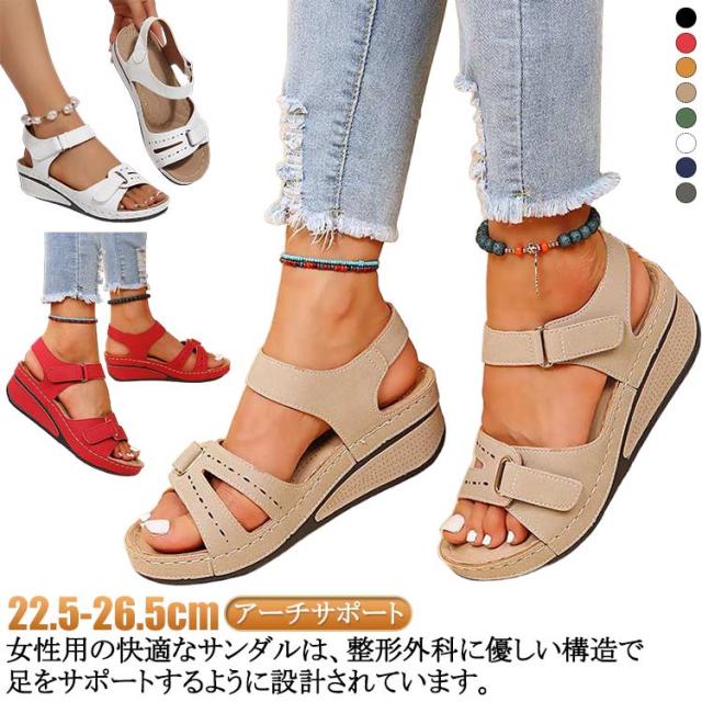 サンダル レディース サマーウェッジプラットフォームサンダル 足底筋膜炎 スポーツサンダル 平らな足用 快適なオープントゥ ビーチサンダル アンクルストラップ ウォーキングシューズ 黒