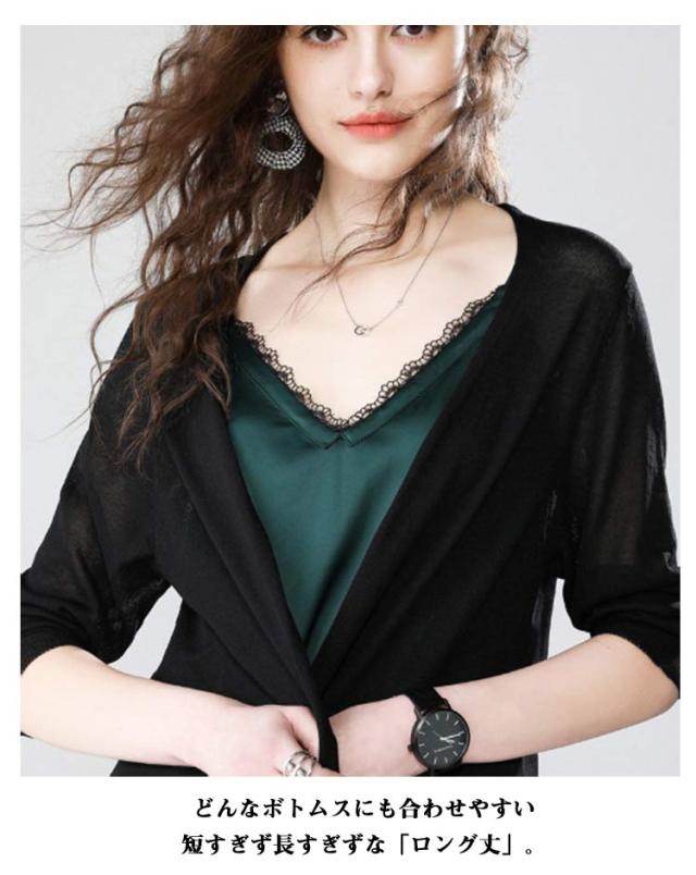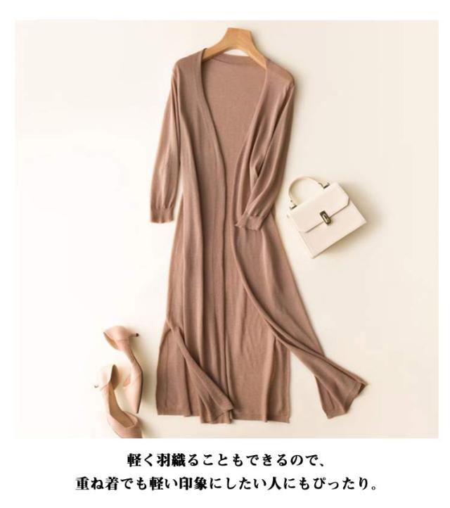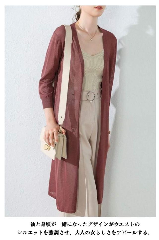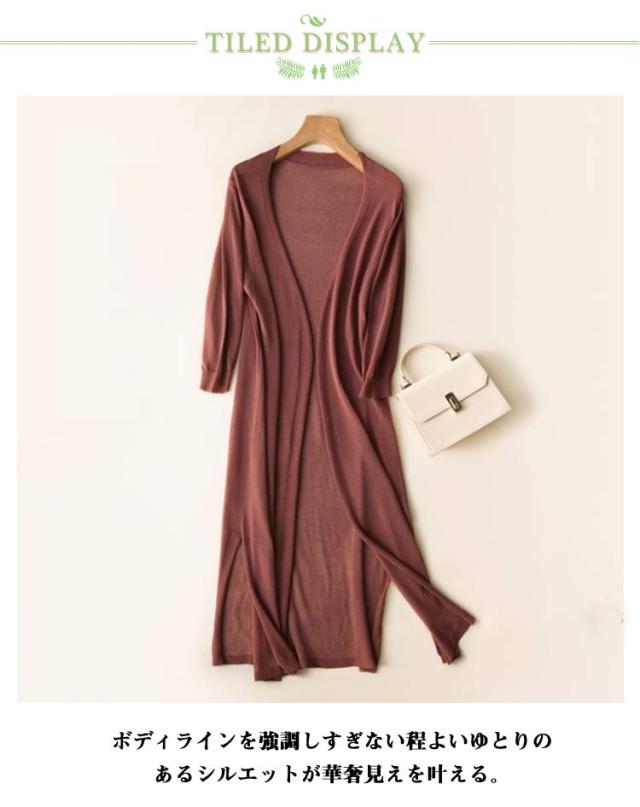 | 大人の抜け感を演出してくれる、上品なサマーカーディガン。 流行に流されることのない定番アイテムをあなたのワードローブに。 袖と身頃が一緒になったデザインがウエストのシルエットを強調させ、大人の女らしさをアピールする。 気になる二の腕や肩のラインもカバーしてくれるので安心感とスタイルアップも叶えてくれる嬉しいデザイン。 メタルっぽくなく、透明感があり、柔らかな光沢を表現できます。 肌触りや見た目にフェミニンさを感じさせてくれるところが人気です! どんなボトムスにも合わせやすい短すぎず長すぎずな「ロング丈」。 絶妙なバランスで、ぐっと女性らしさを高めてくれます。 編み目から素肌が見える透け感も軽やかで涼し気☆ Vネックでセクシーな鎖骨が現れて、デコルテラインをきれいに見せます。 印象的なフリルスリーブデザインで、立体的なラインが手元を華奢な印象に見せる。 袖口に向かって広がるフレアスリーブが、大人かわいい印象に。 裾に施したスカラップデザインが女性らしい♪ インナーにキャミソールを合わせるとトレンドのシースルーがこなれ感アップ。 ボディラインを強調しすぎない程よいゆとりのあるシルエットが華奢見えを叶える。 長袖でUVカットや冷房対策できて実用性ある一枚。 皺になりにくく、型崩れしにくい、お手入れがしやすいです。 薄手ながらも密な編地なので肌寒い時にサッと羽織れる優れもの。 軽く羽織ることもできるので、重ね着でも軽い印象にしたい人にもぴったり。 普段使いはもちろん、オフィスカジュアルなどのきれいめスタイルにも合うのでコーデの幅が広がります。 ワイドパンツやワンピースやロングスカートとの相性も良く、カジュアルなコーデに合わせやすい。 季節の変わり目のちょっとした羽織りにも役立つので重宝すること間違いなし。 シンプルなものこそ、長く使える良いものを選ぶのが正解です。 気持ちいい肌触りと軽い着心地は、一度知ると手放せなくなります。 何よりカラー展開が豊富なので自分好みの色に出会える! 長く使えるデザインで、プレゼントにもぴったりです。 | |