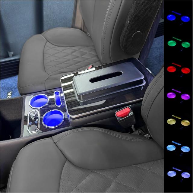 【RGB照明&直感操作】ドリンク&スマホホルダーに7色RGB LED内蔵。クリックで色変更、ダブルクリックでグラデーション、長押しで消灯。記憶機能付きで再点灯もスムーズ。アームレスト開閉で自動点灯するブルーライトは夜間や暗所で便利。