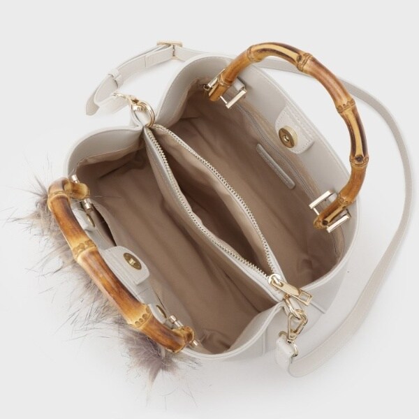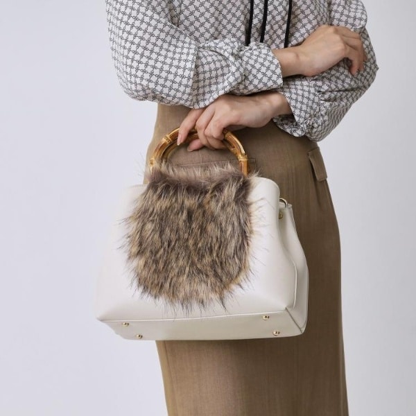 ふんわりとしたフェイクファーと天然のバンブーハンドルが織りなすナチョラルなトートバックは、フェイクファー部分を取り外し可能で、秋冬はぬくもりを、春夏にはすっきりとした表情にチェンジ。