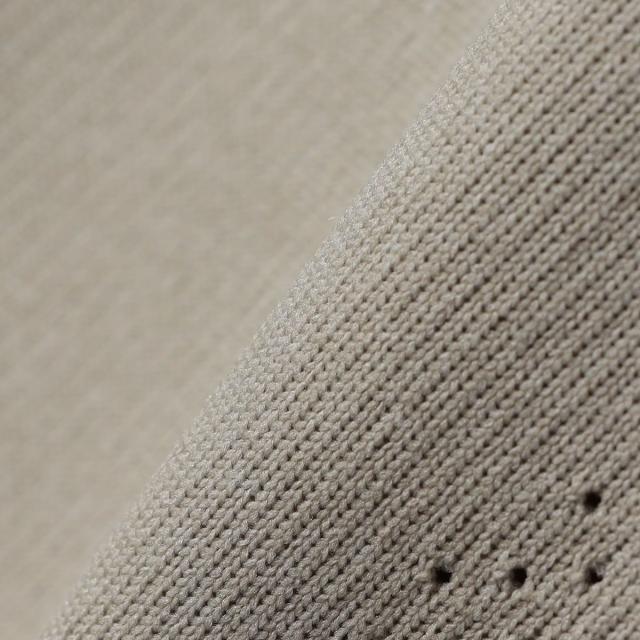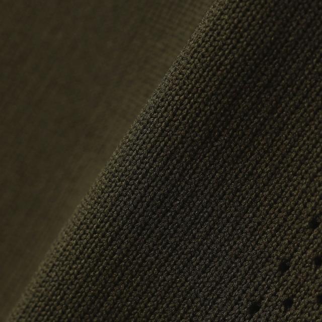 風通しの良さそうなメッシュをニットならではの編地で表現し、首元のVガゼットと両脇にさりげなく施したアイテム。