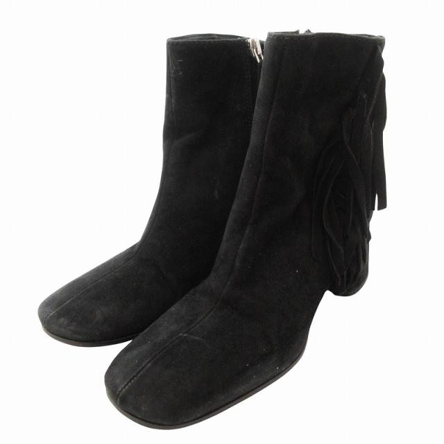 【中古】プラダ PRADA ショートブーツ スクエアトゥ スエードレザー フリンジ サイドジップ 34 黒 ブラック