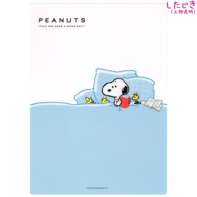 スヌーピーとウッドストックがベッドで本を読んでいる、ほのぼのとしたデザインのしたじきです。