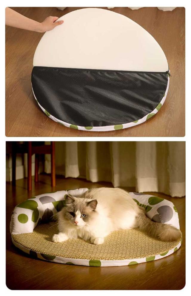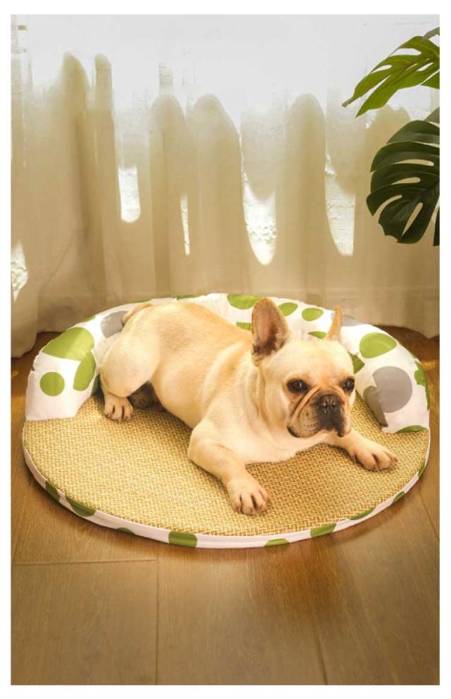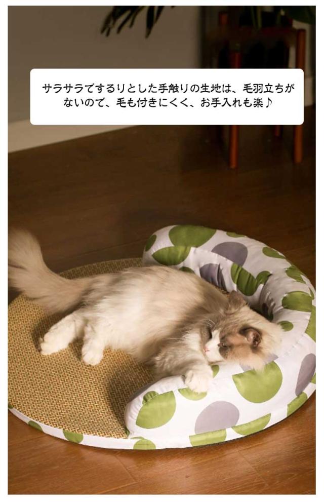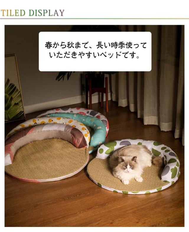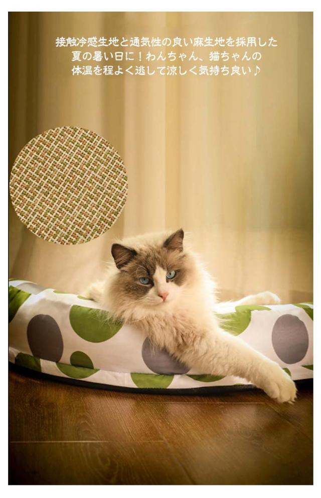 | ワンちゃん、ネコちゃんの夏バテ対策、熱中症予防に! 柔らかな素材ながら、しっかりとハリのある新触感生地に、とっても可愛いです。 接触冷感生地と通気性の良い麻生地を採用した夏の暑い日に!わんちゃん、猫ちゃんの体温を程よく逃して涼しく気持ち良い♪ サラサラでするりとした手触りの生地は、毛羽立ちがないので、毛も付きにくく、お手入れも楽♪ 春から秋まで、長い時季使っていただきやすいベッドです。 | |