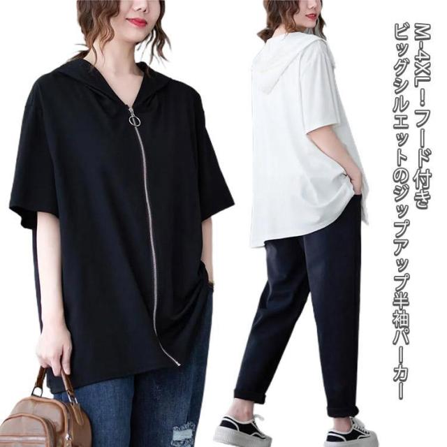 ビッグシルエット 半袖パーカー レディース ジップアップ フード付きパーカー トップス 五分袖 ビッグシルエット 羽織り 大きいサイズ ゆったり カジ