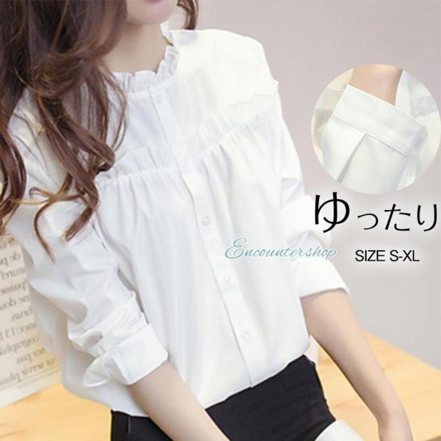 シャツ ブラウス レディース トップス 長袖 綿 フリル フォーマル スタンドカラー フリルネック 白シャツ 着痩せ 通勤 OL 韓国風 おしゃれ