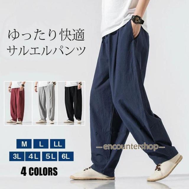 サルエルパンツ メンズ ワイドパンツ リネンパンツ イージーパンツ リネン風 ボトムス 無地 薄手 パンツ ウエストゴム リラックス