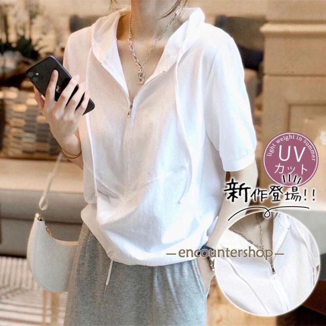 半袖パーカー レディース パーカー 五分袖 フード付き ゆったり ジッパー Tシャツ カジュアル カットソー トップス プルオーバー 夏服 おしゃれ