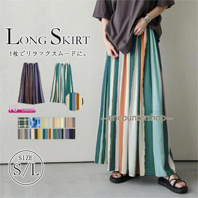 2点で15%オフ!スカート 不規則配色 フレアスカート 縞柄 春 夏 秋 ロング丈 ミモレ丈 Aライン 体型カバー大きめ ウエストゴム ロングスカートチェック