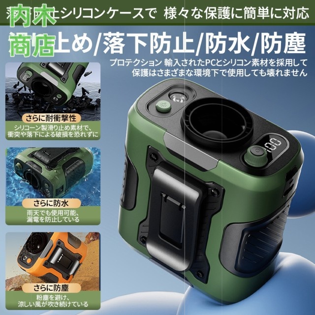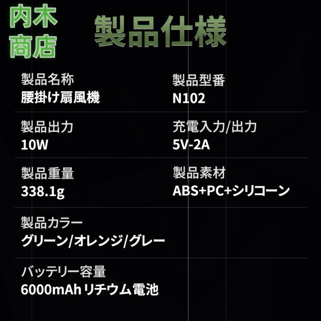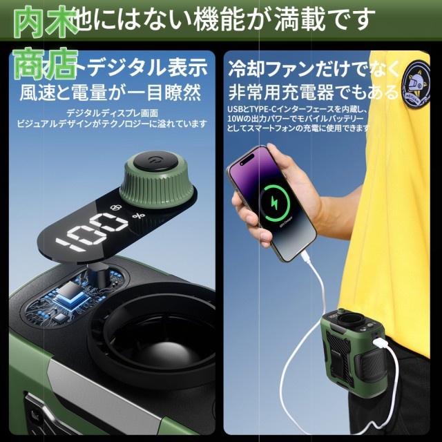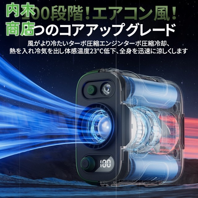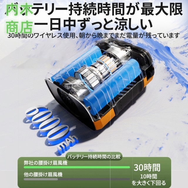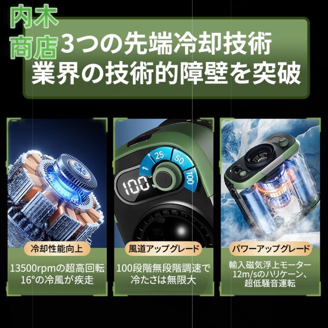 風力は通常の扇風機の10倍に達します。最大12M/Sな送風速度、13500RPM回転速度で3秒ほど360°全身が冷たい風に包まれます。内蔵の6000mAhリチウム電池、弱モードでは約24時間使用可能です。