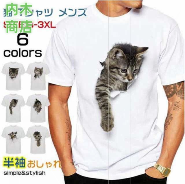 猫 tシャツ メンズ 3D tシャツ 白 半袖 大きいサイズ おしゃれ ティーシャツ トップス プリント ネコ柄 メンズファッション キレイめ カジュアル 夏 メンズTシャツ カットソー ゆったり S-3XL 可愛い プレゼント