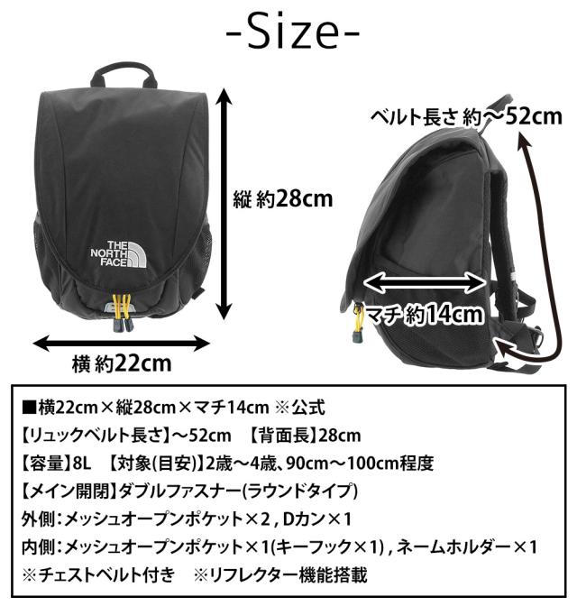 | サイズ(約) ※当店実寸値 | 公式サイズ 横22cm×縦28cm×マチ14cm 【背面長】28cm 【リュックベルト長さ】〜52cm 【容量】8L 【対象年齢(目安)】2歳〜年少(4歳)、身長90cm〜100cm程度 | ||